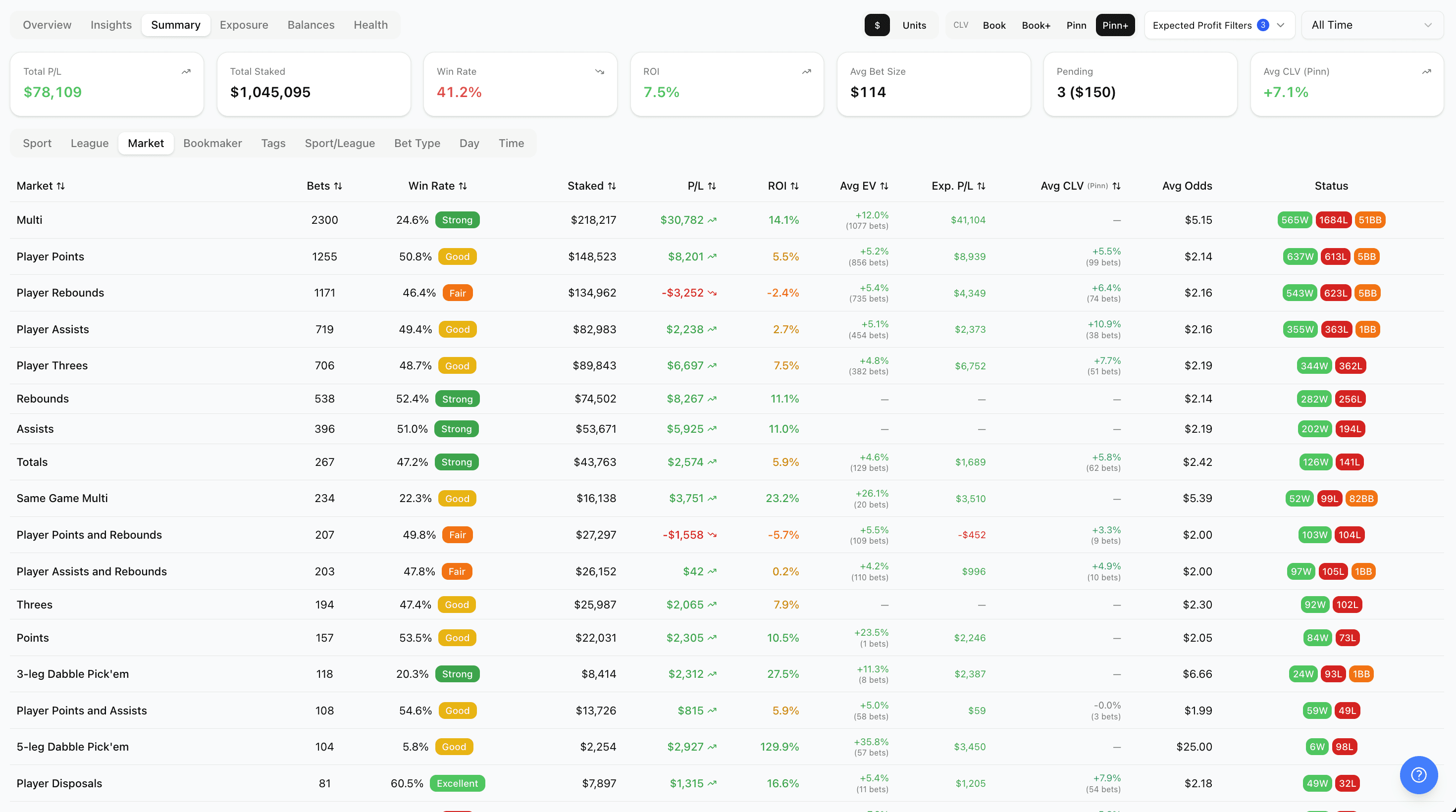 The Strategy Tester: You're trying out arbs, +EV, low holds, prop models, or your own custom system. You need to tag bets by strategy and compare them side by side, so you can double down on what works and cut what doesn't.