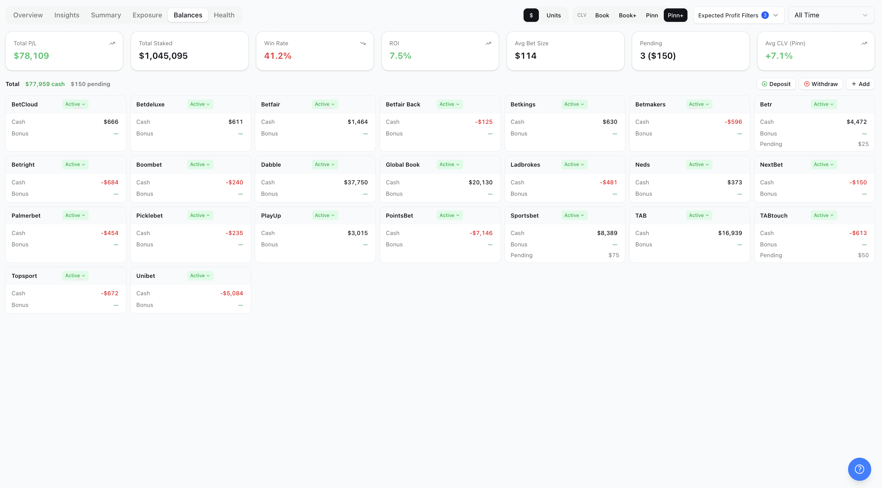 The Multi-Account Manager: You've got accounts at Sportsbet, Ladbrokes, Pointsbet, Neds, Betr, plus a Betfair Exchange balance, and you've lost track of where your money actually sits. You need one dashboard showing every balance, every bet, every account.