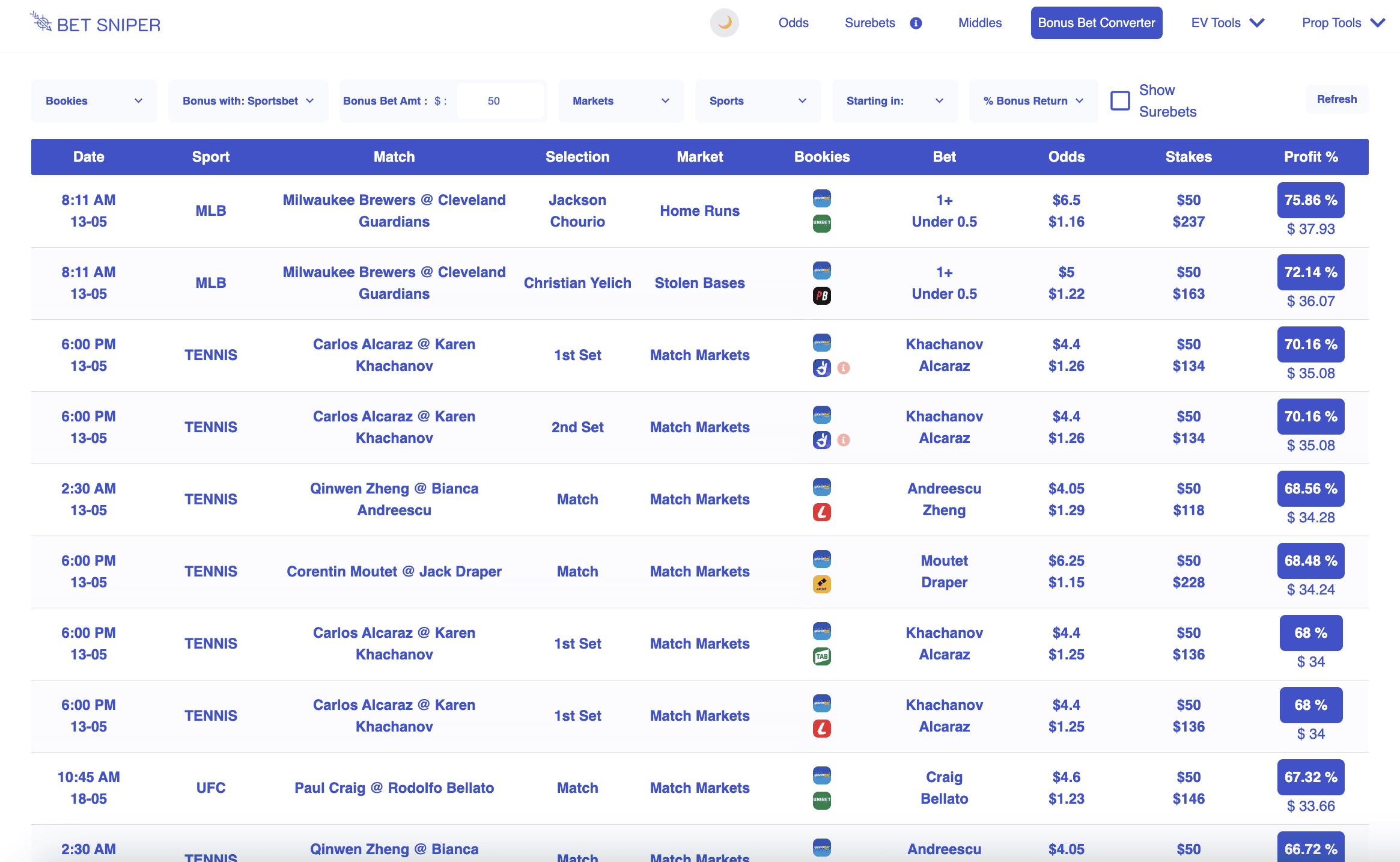 Quickly find the best opportunities to turn your bonus bets into risk-free cash