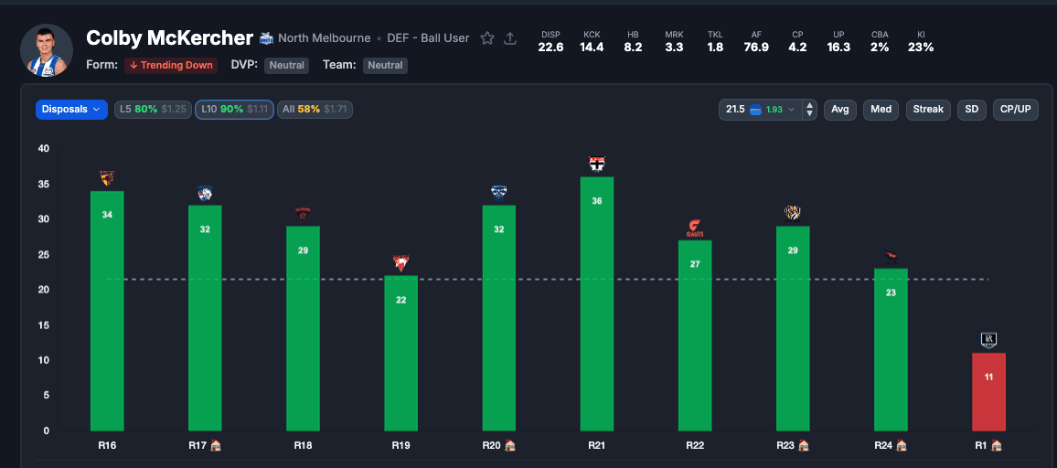 Nine of his last ten games have cleared 22 disposals. His L10 reads 34, 32, 29, 22, 32, 36, 27, 29, 23 — and then 11 in Round 1. That most recent blip is the only thing keeping Sportsbet from paying a shorter price. McKercher was coming off an injury so played limited game time, but nine consecutive 22+ games before that tells you where the floor really is.