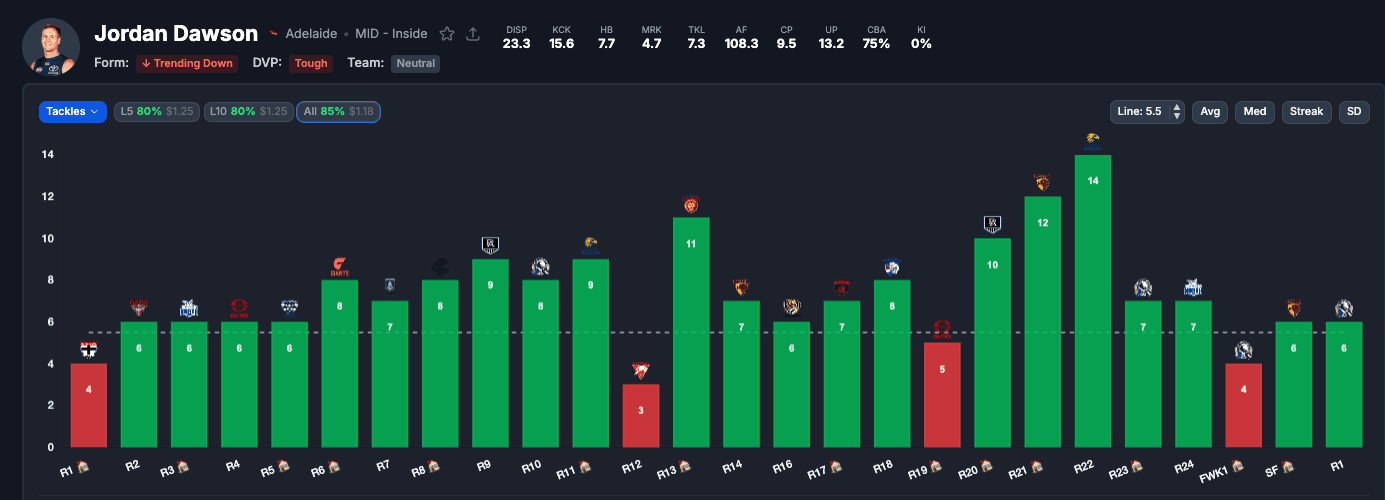 This week Adelaide face Western Bulldogs — a physical, contested-game team that plays exactly the style Dawson thrives against. Expect a proper fight in the middle, which is precisely when his tackle numbers spike. At $1.71, the market implies roughly 58% probability. The data says closer to 85%. That gap is where the value lives.