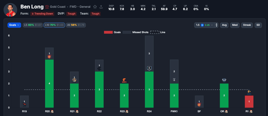 Gold Coast’s profile: $1.12 market favourites, 35.5-point line. When a team is expected to win by six goals, their forward line gets a lot of scoring chances — and Long is one of their key threats up forward.