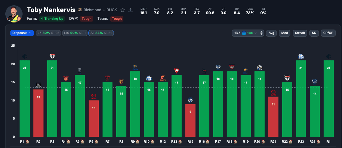 Toby Nankervis 14+ Disposals — 9/10 L10 @ $1.66 Sportsbet