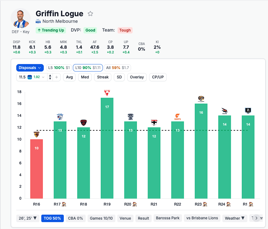 The matchup angle confirms it. Brisbane sit at 6th most generous to key defenders for disposals — squarely soft tier. Brisbane bomb the ball forward early and Logue's intercept role at the back of the North Melbourne defence is built to feast in those exact conditions.
