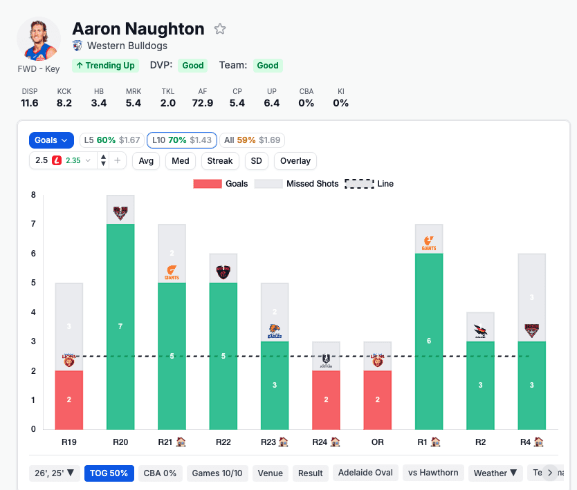 Hawthorn rank 6th most generous to key forwards on goals — soft tier. Naughton's role as the Bulldogs' primary big-bodied forward is the ideal profile to attack this matchup, and $2.35 on a player averaging nearly 4 goals/game is overpriced.