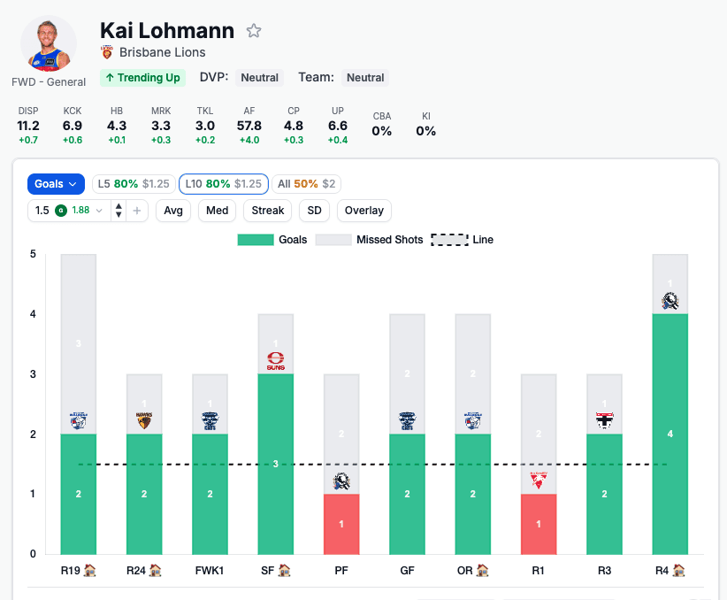 He's the in-form Brisbane small forward and they've been targeting him deep inside 50. North Melbourne sit at rank 12 against general forwards for goals — squarely neutral, not a matchup that shuts him down. The recent 4-goal bag is the exclamation point on a player at the absolute peak of his role.