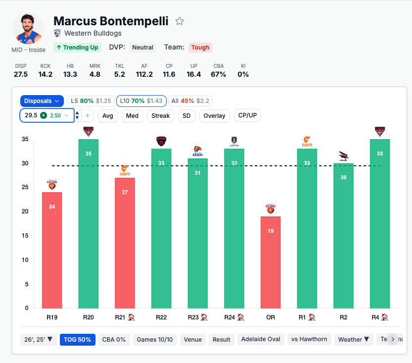 The juiciest big-line play of the round. The Bont's L10: 35, 30, 33, 19, 33, 31, 33, 27, 35, 24 — averaging 30.0 disposals with three 33+ outings and two 35-touch monsters. The single 19 is the only legitimate miss; six of ten are 30 or better.
