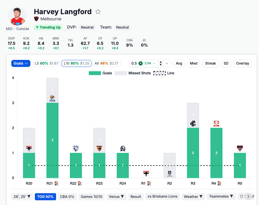 Melbourne have been running Langford on the wing as a pure outside midfielder, but his role pushes him through forward 50 every game and he's getting genuine looks at goal nearly every time. Brisbane's defence hasn't been shutting down opposition midfielders pushing forward to the scoreboard, and Langford's role manufactures one clean shot a game almost without fail. He doesn't need volume — one set shot is all this line asks for.
