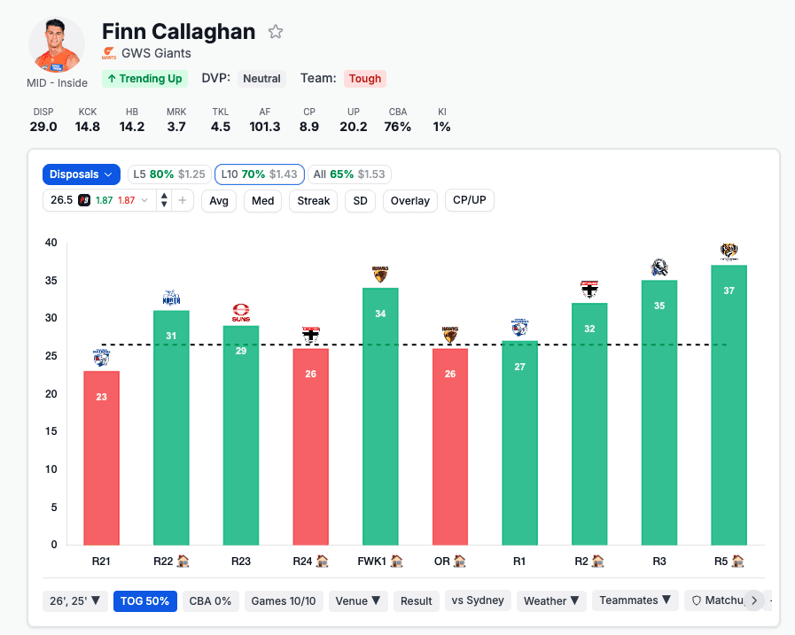 The top-end disposal play of the round. Callaghan's L10: 37, 35, 32, 27, 26, 34, 26, 29, 31, 23 — seven of ten cleared at 27+, averaging exactly 30 disposals per game with three back-to-back 30+ outings to open the sample (37, 35, 32). The misses are tight numbers (26, 26, 23), not blowouts — every single game in the sample is a meaningful possession game