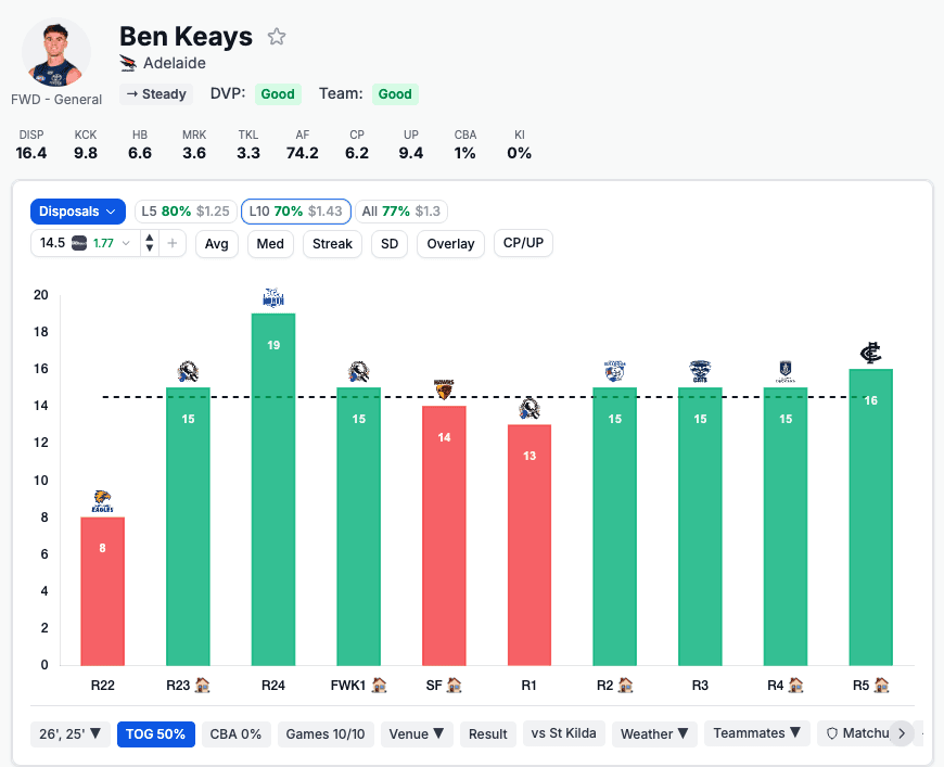 Keays is playing a half-forward flank role for Adelaide and accumulating his touches around the forward arc rather than through the middle. St Kilda have been one of the most permissive defensive sides in the league at giving up disposals to half-forwards who push up — exactly Keays' profile — and his role isn't going to change against them. The 15+ line sits right at his floor, which is exactly the kind of play you want for a steady multi anchor.