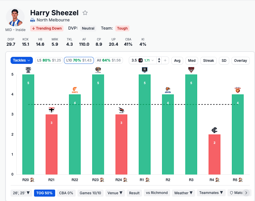 Harry Sheezel 4+ Tackles — 7/10 L10 @ $1.71 PointsBet